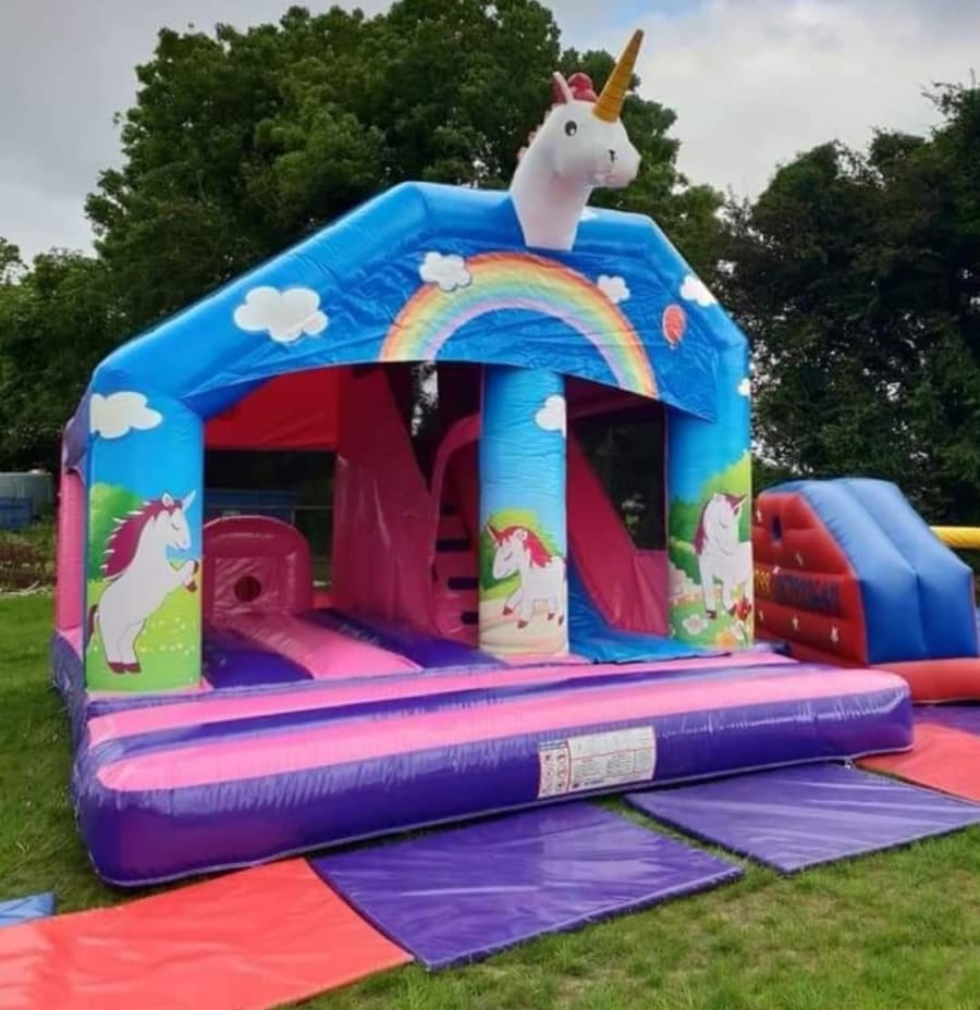 Our Unicorn themed combi castle and slide is perfect for all the Unicorn lovers. This unit has a large bouncy castle and a slide to the side with beautiful colours and prints of Unicorns throughout with a large Unicorn on top. This castle is very popular for small children while also suitable for children of all ages. It is fully covered with supervised netting all round. This castle will offer hours of entertainment no matter what the weather.