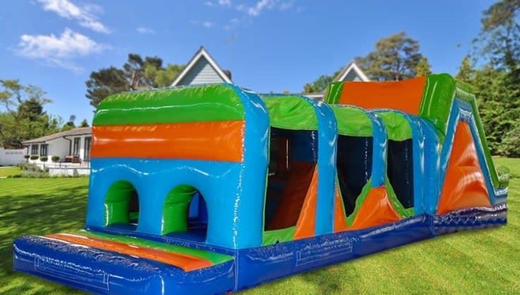 Our MultiColour Rush Obstacle Course is suitable for children of all ages. It's wonderful bright colours offer a neutral choice of inflatable for both boys and girls. Prepare to be amazed at how much fun your kids can pack inside a 18 x 42 feet inflatable. The course has two arched openings on one end, a number of obstacles inside the belly followed by a tall climbing wall that links you to the huge slide that brings you out the other end.