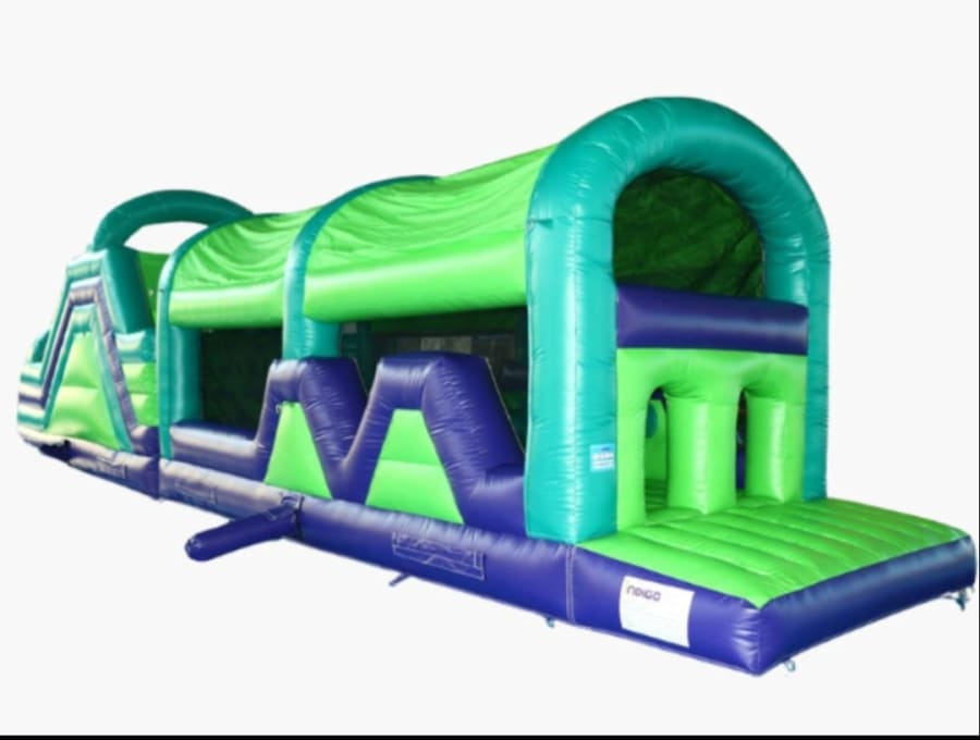 Our Adrenaline Rush Obstacle Course is a very colourful inflatable with vibrant green and purple throughout. This obstacle course is very suitable for both girls and boys bringing hours of entertainment on their special day. Enter the obstacle course through two openings on one end, navigate your way past a number of obstacles before finishing off on a double slide to bring you out the other end.